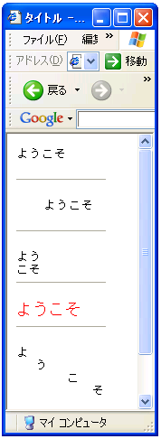 段落の指定や改行をしたい場合は、それ用のタグを使う必要があります。 <p>〜</p>:段落を示すタグ。</p>の後ろは一行改行されます。 <div align="○○">〜</p>:align属性は配置の指定。 ○○を「left」にすれば左寄せにできます。 同様に「right」で右寄せ。「center」で中央揃えが指定できます。 <br>:改行の指定ができます。 <font size="○○" color="○○">〜</font>: 文字の色やサイズ、書体の設定ができます。 size:文字サイズ −6〜+6まで color:カラーコードで文字色の指定 <b>〜</b>:文字を太字にすることができます。文章の一部を強調したいときなどに便利です。 <u>〜</u>:下線を入れることができます。太字と同じく文を強調できます。 <pre>〜</pre>:改行、space、tabを反映するようになります。 改行をたくさん入れようがスペースを入れようが、表示結果は変わりませんが、preタグで囲まれた範囲ではそれが反映されるようになります。 <hr size="2" width="100" align="left">:区切り線。 sizeで太さ widthで長さ(%で指定可能画面に合わせて長さが変わります) alignで位置が指定できます。leftなら左詰め、rightなら右詰め、centerなら中央揃えです。 cororで色を指定することも可能です。 では実際に上のタグを使ってみましょう。こんな↓感じになります。