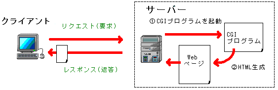 動的ページ(CGI)では、サーバーがクライアントにWebページを要求される度に、 CGIプログラムで新しいHTMLを生成します。