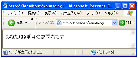 #!c:\perl\bin\perl print "Content-type: text/html\n\n"; open(READ, "<log.dat"); $count=<READ>; close <READ>; ++$count; open(WRITE, ">log.dat"); print WRITE, $count; close <WRITE>; print "あなたは$count番目の訪問者です"; |