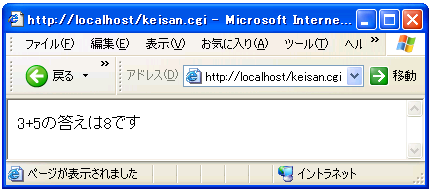 #!c:\perl\bin\perl print "Content-type: text/html\n\n"; $a=5; $b=3+5; print "3+5の答えは$bです"; |