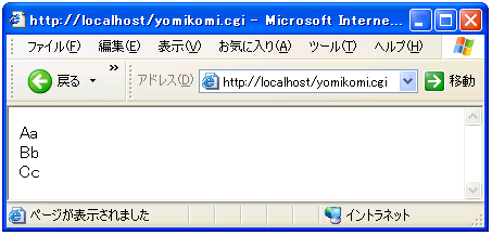 #!c:\perl\bin\perl print "Content-type: text/html\n\n"; open(FILE, "<abc.txt"); #abc.txtというファイルを読み込み @data=<FILE>; #abc.txtを@dataに代入 close <FILE>; #ファイルを閉じます print "@data[0]<br>"; #1行目を表示して改行 print "@data[1]<br>"; #2行目を表示して改行 print "@data[2]<br>"; #3行目を表示して改行 |
