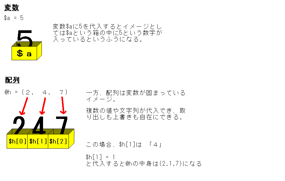 #から後ろは、「コメント」となり、ラクガキをしてもプログラムには反映されません。 プログラムだけだと、どうしても人間には内容がわかりにくいので、 わかりやすいコメントを入れておくことで、プログラムが見やすくなります。 open(FILE, "<abc.txt"); 「open」は、コメントの通り引数で指定したファイルを読み込む関数です。 「FILE」はファイルハンドルと言い、複数のファイルを開いたときなどに 個々を指定する時などに使います。 「<」は読み込み専用で開くという意味です。 close <FILE>; その名の通り、指定したファイルを閉じます。 print "@data[0]<br>"; 読み込んだファイルを@dataという名前のデータの入れ物の中に入れています。 この入れ物は、「配列」と言い、変数の塊のようなものです。 名前の先頭に「$」がつくと変数、「@」がつくと配列となります。 変数と配列については↓のようになっています。 print "@data[0]<br>"; そして、最後のprint行で、読み込んだテキストデータのうち上から3行までを 順番に表示して<br>で改行・・・という処理をして表示しています。 ■アクセスカウンター 表示するたびに1ずつ数字が増えていきます。 ようやくCGIらしくなってきました。 ●ソースコードと解説 |