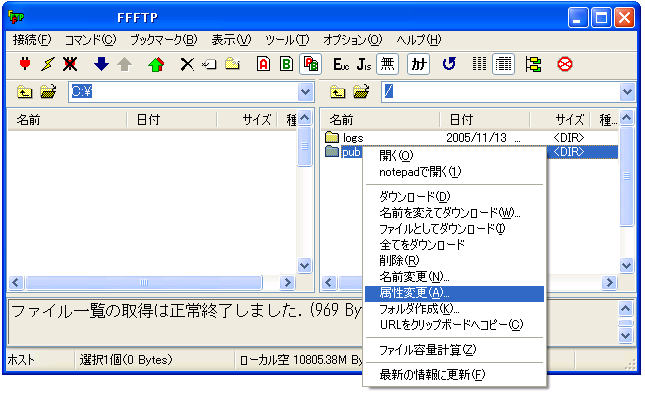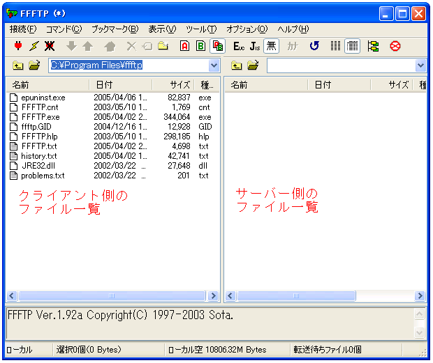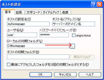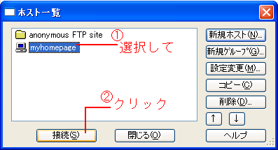サーバーにアップロードHTMLやCGIを使って、ホームページのデータを作っただけでは、 インターネット上で、そのホームページを見ることはできません。 なぜなら、以前ホームページを見る仕組みについて 説明したように、サーバーと呼ばれるホームページの置き場所に あらかじめホームページのデータを置いておく必要があるからです。 ホームページを作って、インターネットで見ることができる状態にするには 1.ホームページを作成する(プログラムを作る) 2.サーバーを借りる 3.FTPソフト(ファイル転送ソフト)をインストールする 4.サーバーに、作成したWebページデータをアップロードする というようなステップを踏みます。 サーバーのレンタルについては、個人の要望などもありますので 検索をして探してみてください。 登録をして、IDとパスワードを発行してもらってください。 同時に「あなたのホームページアドレスはhttp://www.*** ですよ」という通知があると思います。 以下 レンタルサーバーの一例です サーバーを借りるのは本来有料ですが、 ホームページ内に広告を貼ることで、料金が無料になるサーバーも多いです。 Yahooジオシティーズ (無料。CGIは設置できません) トクトク (無料。ホームページ容量無制限。CGI使用可能。広告がやたらと多い) わいにじ (有料ですが、広告も無く、細かい制限もありません) サーバーと同時に、掲示板やアクセスカウンターなどもレンタルすることができるところもあります。 その場合は、CGIのプログラムを作成したりする必要がありません。 ■FTPソフトのインストール ホームページを作成したら、それをインターネット上のホームページ置き場に データをアップロード(ダウンロードの逆)をする必要があります。 この、アップロードをするためにFTPソフトというものが必要になります。 FTPソフトの中で代表的なFFFTPというソフトのインストールと使用方法を解説していきます。 1.FFFTPの配布ページに行きます → こちら 2.FFFTPソフトの最新版をダウンロードします 3.ダウンロードが完了したら、アイコンをダブルクリックするとインストールが始まります 4.あとは手順にしたがって「次へ」ボタンをクリックしていってください 特に設定を変更する必要はありません。 5.インストールが終わったら、デスクトップにこのようなアイコンが表示されます これでインストールは完了です。 ■FFFTPを使い、サーバーにWebページをアップロードする 1.FFFTPのアイコンをダブルクリックして起動します ※「メールアドレスを入力してください」というダイアログボックスが出ると思いますが、 サーバーに接続するときに必要なものではないので[キャンセル]をクリックしても問題ありません。 FFFTPの画面はこのようになっています。 左側に自分のパソコン側のファイル一覧が表示され、 右側にはサーバー側のファイル一覧が表示されます。 2.ホスト(サーバー)の設定をします FFFTPを実行すると、「ホスト一覧」というダイアログボックスが現れます。 (左上のメニューの「接続」→「ホストの設定」でも同様に出ます) 「新規ホスト」をクリックして、ホストの設定をします。 [ホストの設定名] どんな名前でも構いません。自分の分かりやすいと思う名前をつけてください。 [ホスト名(アドレス)] サーバーのドメイン名を入力します。 [ユーザー名] サーバーにログインするためのユーザーIDを入力します。 [パスワード/パスフレーズ] サーバーにアクセスするためのパスワードを入力します。 ※レンタルサーバーの登録時に「ホスト名」と「ユーザー名」「パスワード」が発行され、通知されます。 [ローカルの初期フォルダ] ホームページ用のフォルダを指定します。 「→」の四角をクリックして、ホームページ用のフォルダを選んでください。 [ホストの初期フォルダ] 接続した時に開く、サーバー側のフォルダを指定します。空欄でもよい場合もあります。 3.サーバーにファイルを転送します @インターネットに接続しておきます。 Aさきほど設定したホストの設定名をクリックして選択状態にし、「接続」をクリックします。 B「ファイル一覧の取得は正常終了しました」と表示されたら接続成功です。 ※サーバー側に「public_html」というフォルダがあるのを確認してください。 もし無い場合は、「public_html」という名前で、フォルダを作成してください。 C「public_html」フォルダをダブルクリックして開き、そのフォルダの中にファイルをアップロードします。 サーバー(ホスト)側のアドレスが、「・・・/public_html」となっていればそれで大丈夫です。 D[ミラーリングアップロード]を行なってください。ファイルを全ていっぺんにアップロードできます。 個別にファイルをアップロードしたい時は、アップロードしたいファイルを右クリック→アップロードをクリックしてください。 E接続したときのように「ファイル一覧の取得は正常終了しました」と表示されたらアップロードは成功で