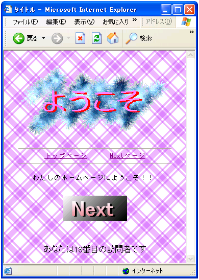 #!c:\perl\bin\perl print <<END; <html> <head> <meta http-equiv="Content-Type" content="text/html; charset=Shift_JIS"> <title>タイトル</title> </head> <body background="image/back01.png"> <pre> <div align="center"><img src="image/youkoso.gif" width="298" height="141"> <hr size="1" width="300" align="center"> <a href="index.cgi">トップページ</a> <a href="next.html">Nextページ</a> <hr size="1" width="300" align="center"> <p>わたしのホームページにようこそ!!</p> <a href="next.html"><img src="image/next.PNG" width="125" height="50" border="0"></a> </div> </pre> </body> </html> END open(READ, "<log.dat"); $count = <READ>; close READ; ++$count; open(WRITE, ">log.dat"); print WRITE $count; close WRITE; print "<center>あなたは$count番目の訪問者です</center>"; |