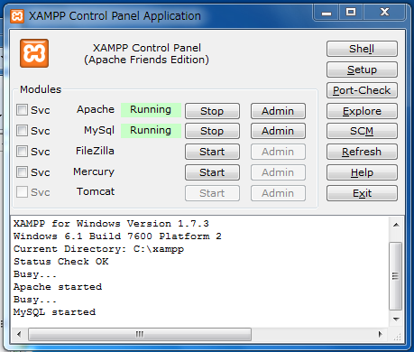 - XAMPP for WindowsのコンソールでApache(Webサーバ)とMySQL(RDBMS)が起動していることを確認。