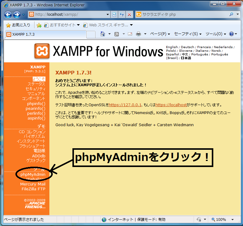 - ブラウザからhttp://localhost/xampp/にアクセスし,"phpMyAdmin"をクリック。