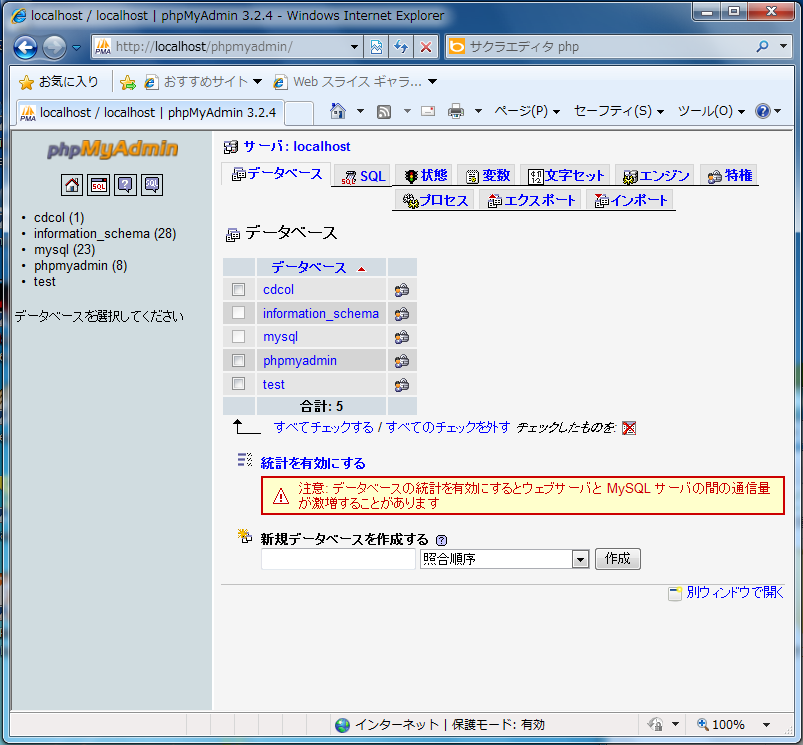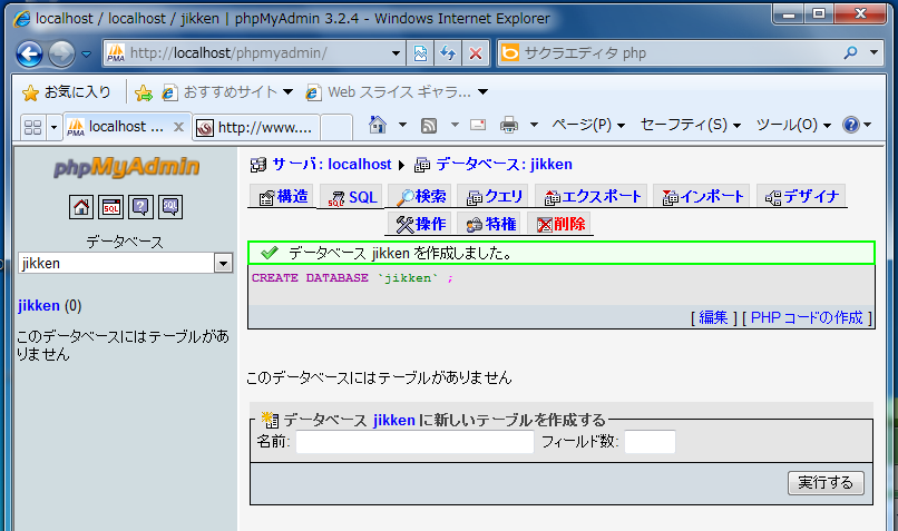 - phpMyAdminのトップページから「データベース」をクリック→画面下の「新規データベースを作成する」のテキストボックスにデータベース名(ここでは"jikken"とする)を入力して「作成」ボタンをクリック。