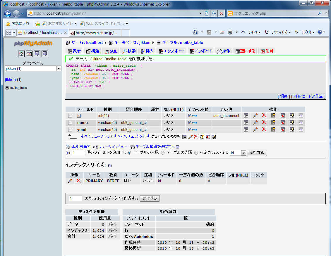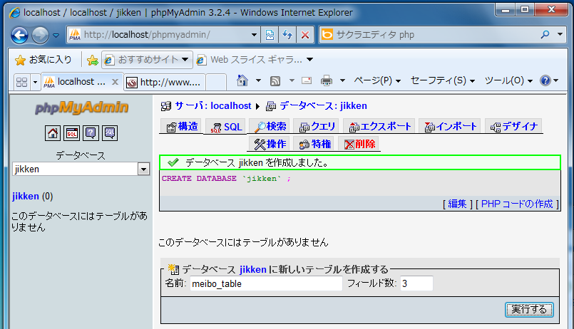 - 作成した"jikken"データベースが画面左に現れるので,それをクリックしてデータベース"jikken"(この時点ではカラ)を開き,テーブル(ここでは"meibo_table"とする)を作成。