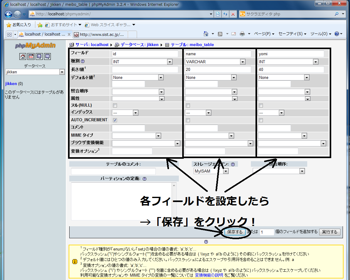 - "meibo_table"を作成後,テーブル内のフィールドを設定し,「保存」をクリック。