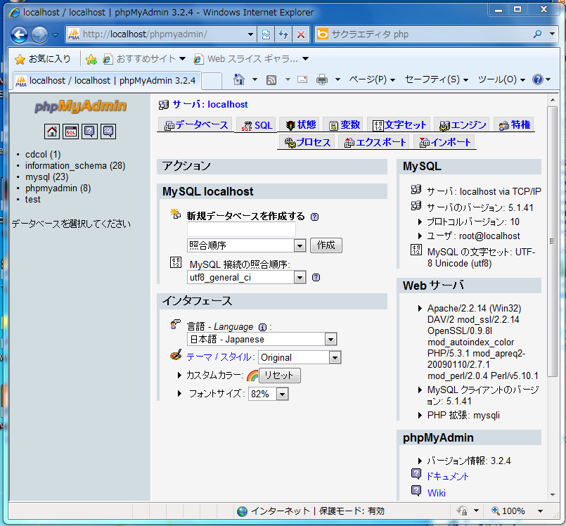 - MySQLのrootのパスワードが設定されていなければ,直接phpMyAdminの操作画面が表示される。